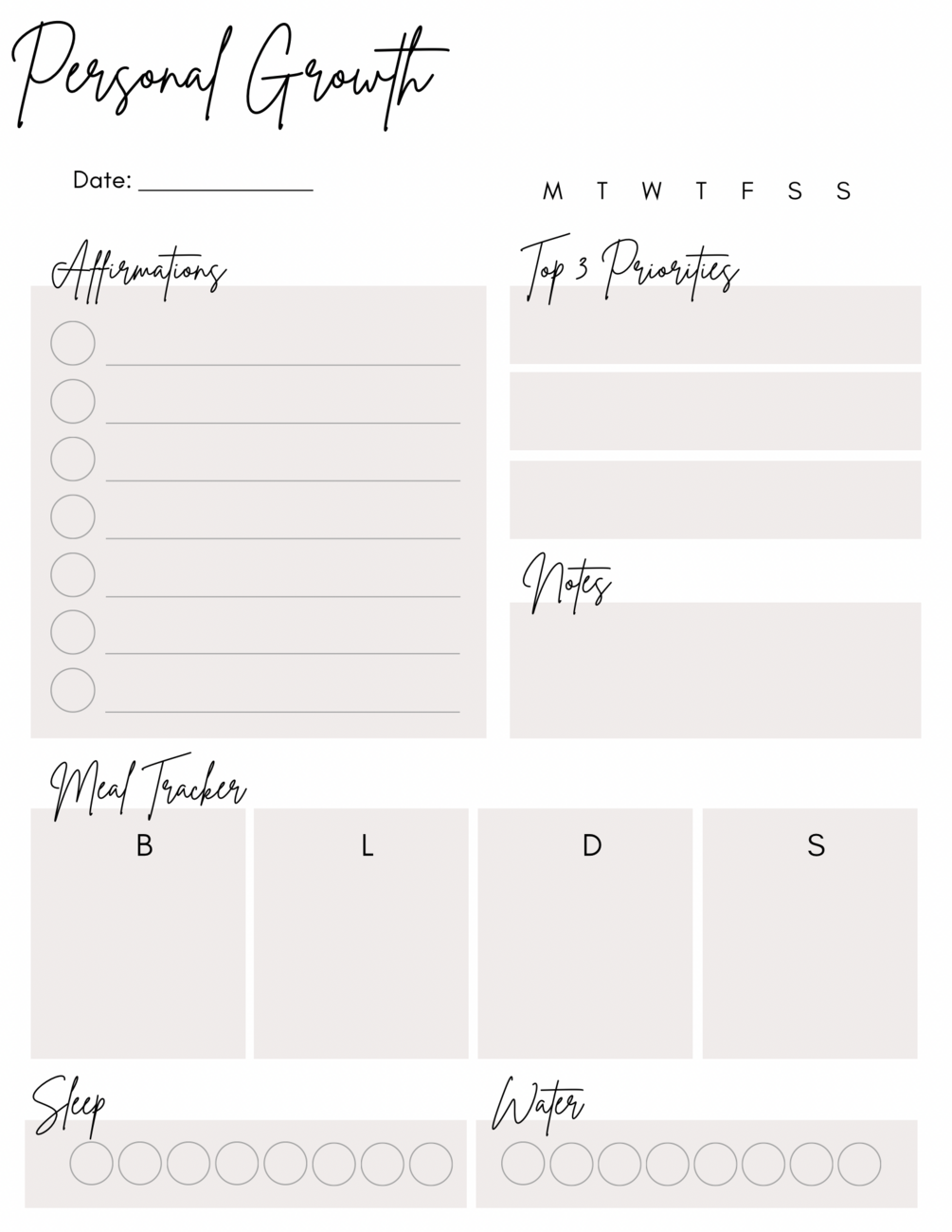 Personal growth journal note page, tracking meals, sleep, water, priorities, affirmations, notes.